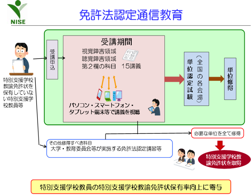 NISE免許法認定通信教育により、特別支援学校教諭の一種又は二種免許状の取得に必要な単位の一部を修得することができます。ただし、教員免許状は、都道府県の教育委員会が授与するものであり、各都道府県の教育委員会規則で取得に必要な単位を定めるため、本研究所の通信教育で修得できる単位で取得しようとする免許状の必要単位が満たされるか否か、また、申請に必要な条件や書類について、あらかじめ所轄の都道府県教育委員会に確認してください。