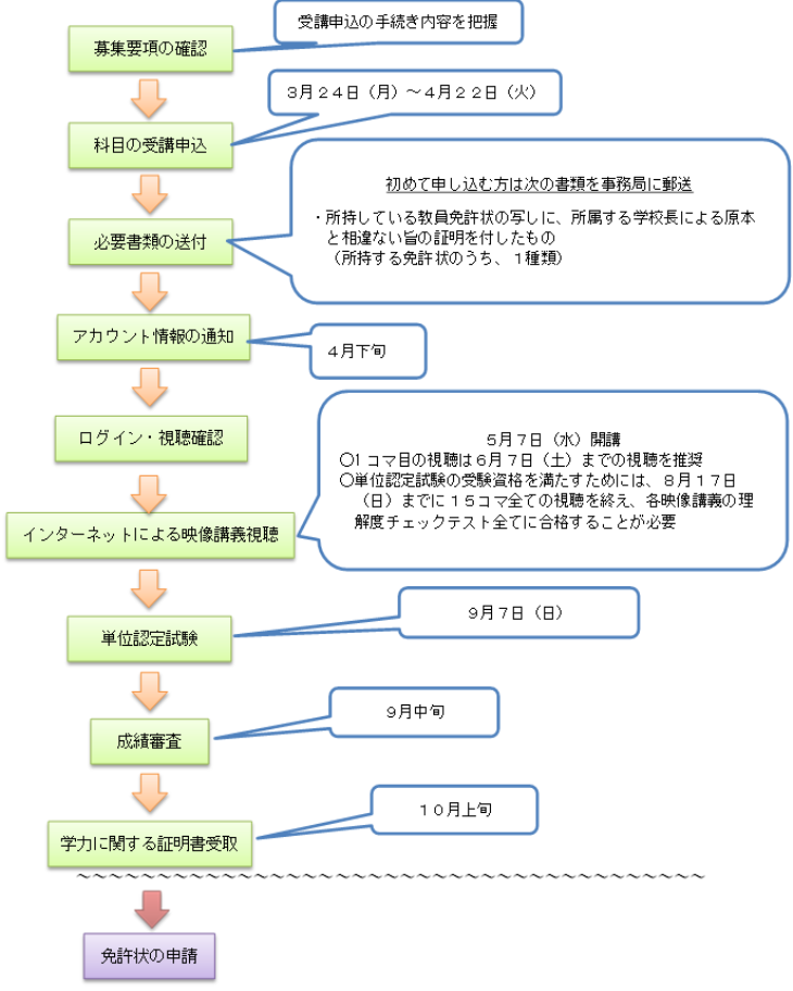 NISE免許法認定通信教育の映像講義は、インターネットによって配信されます。受講から単位認定までの流れは以下のとおりです。
